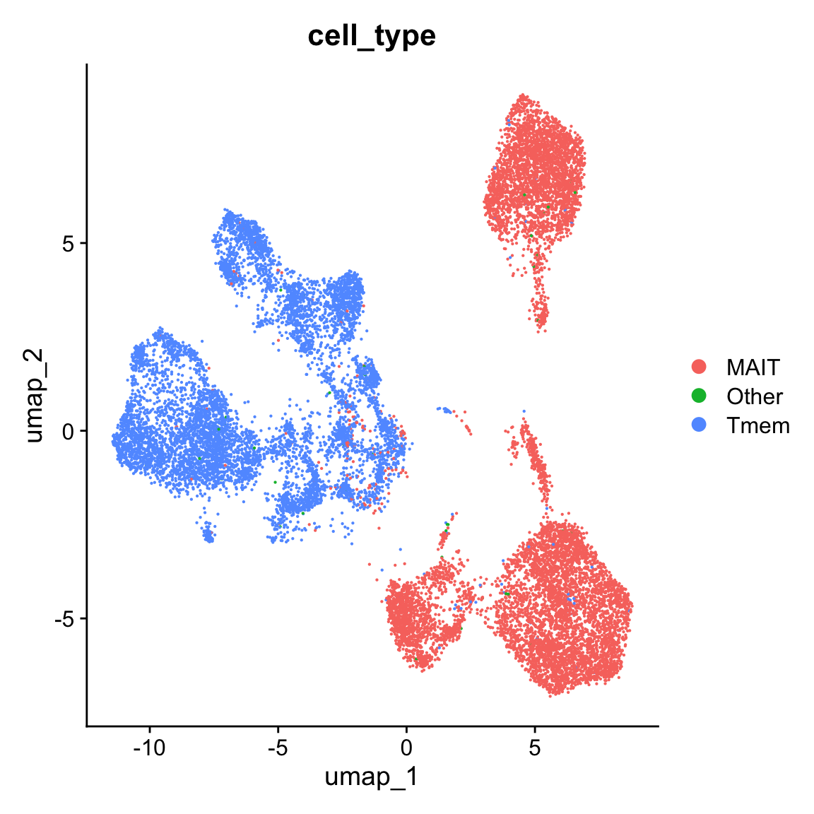 To check for possible biases in our MAIT cell annotation we want to plot the same UMAP representation with the “endogenous” labels from Garner et al. publication.