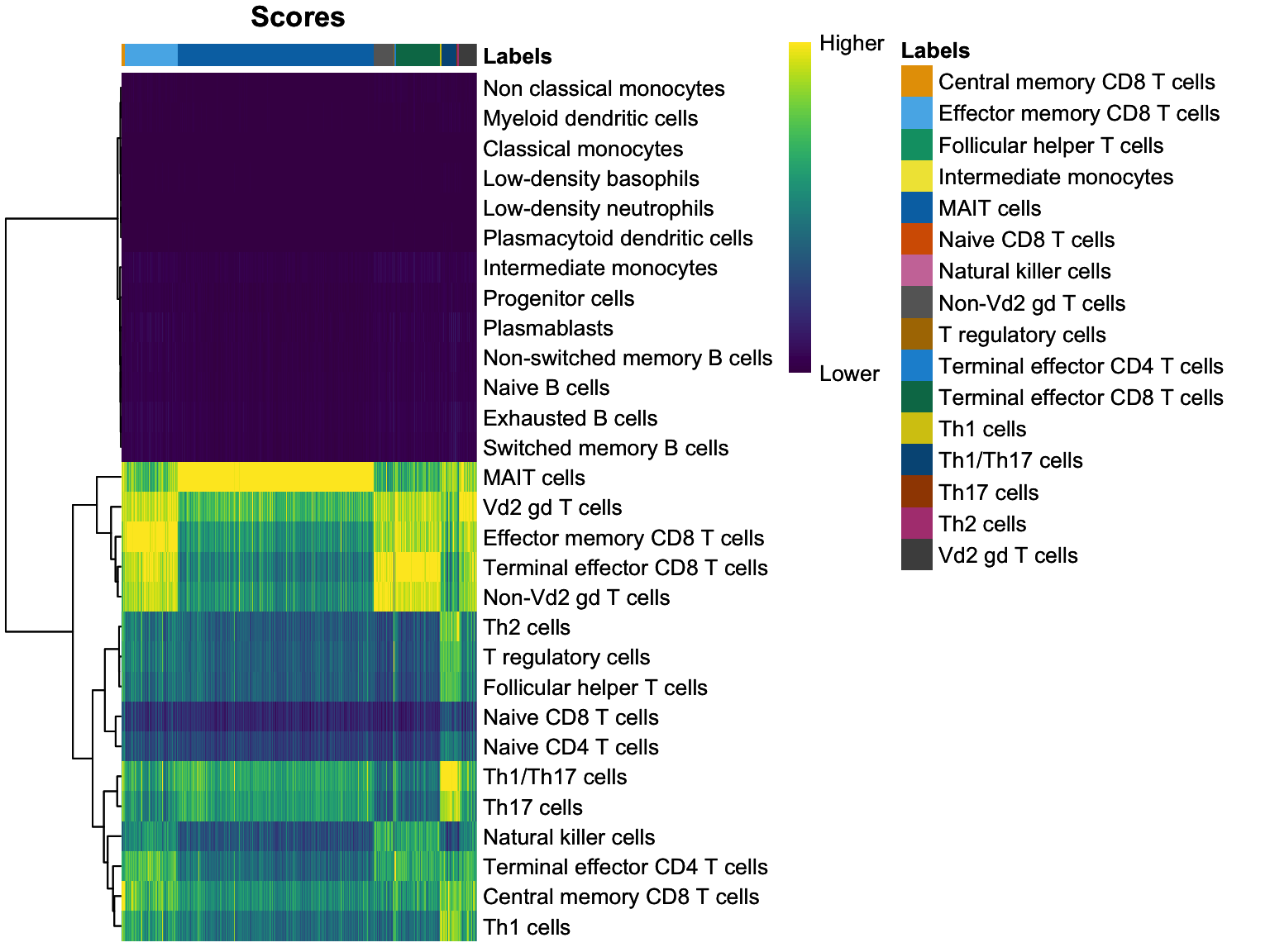 We can see that the scores between different cell types (columns) are different for each cell (row) and before we made this visualization the SingleR algorithm assigned each cell to a certain cell type based on the ranking these scores.