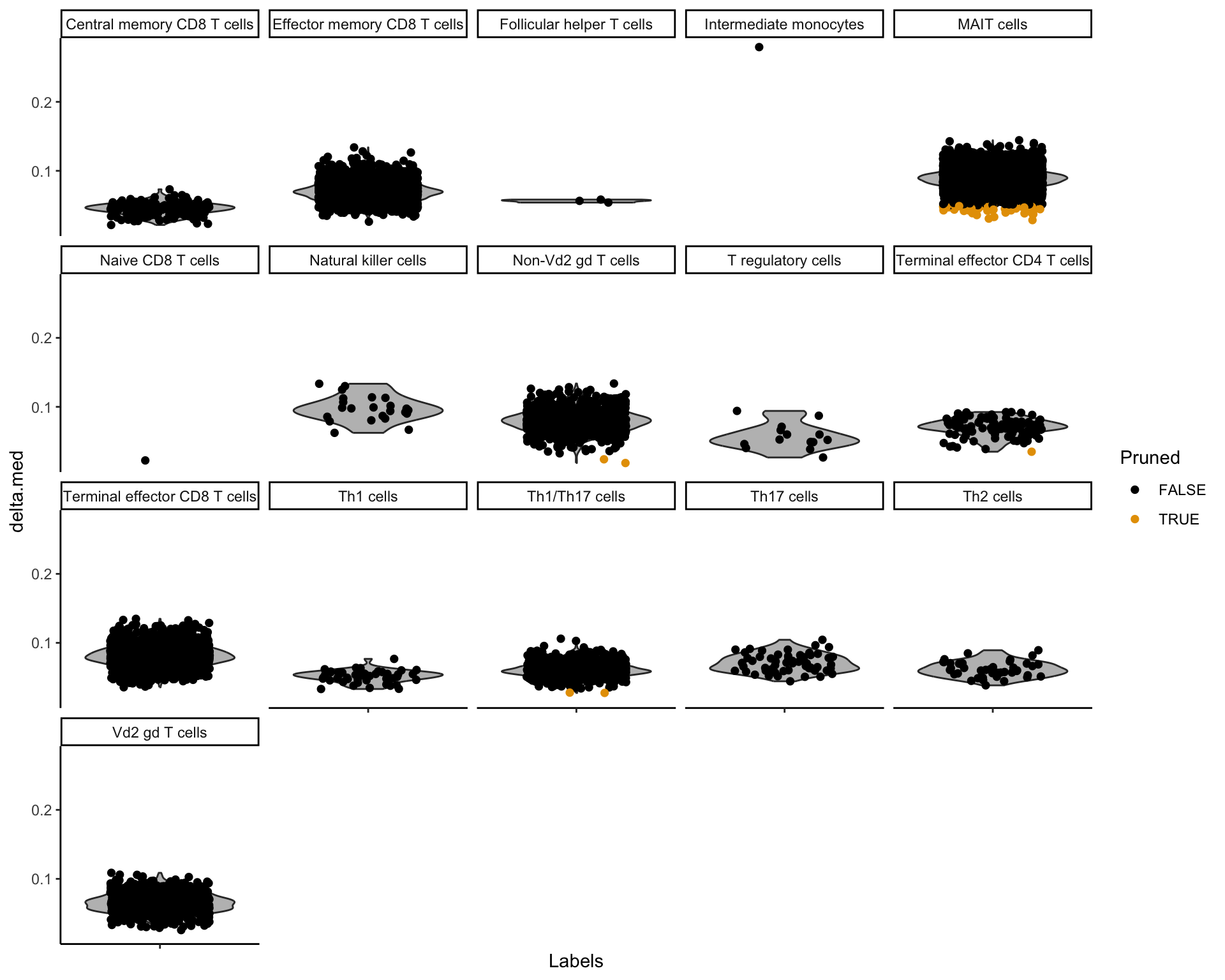 After that we plot so-called delta-distribution plot showing the false-positive cell label assignment rate. Each cell type projected on a query dataset is represented with a single violin plot where each cell is a dot.